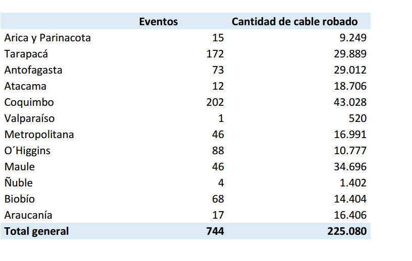 Las regiones con una mayor cantidad de cable robado por delincuentes fueron Coquimbo (43.028 metros), Maule (34.696 metros), Tarapacá (29.889 metros), Antofagasta (29.012 metros); Atacama (18.706 metros), Metropolitana (16.991 metros), Araucanía (16.406 metros) y Biobío (14.404 metros).